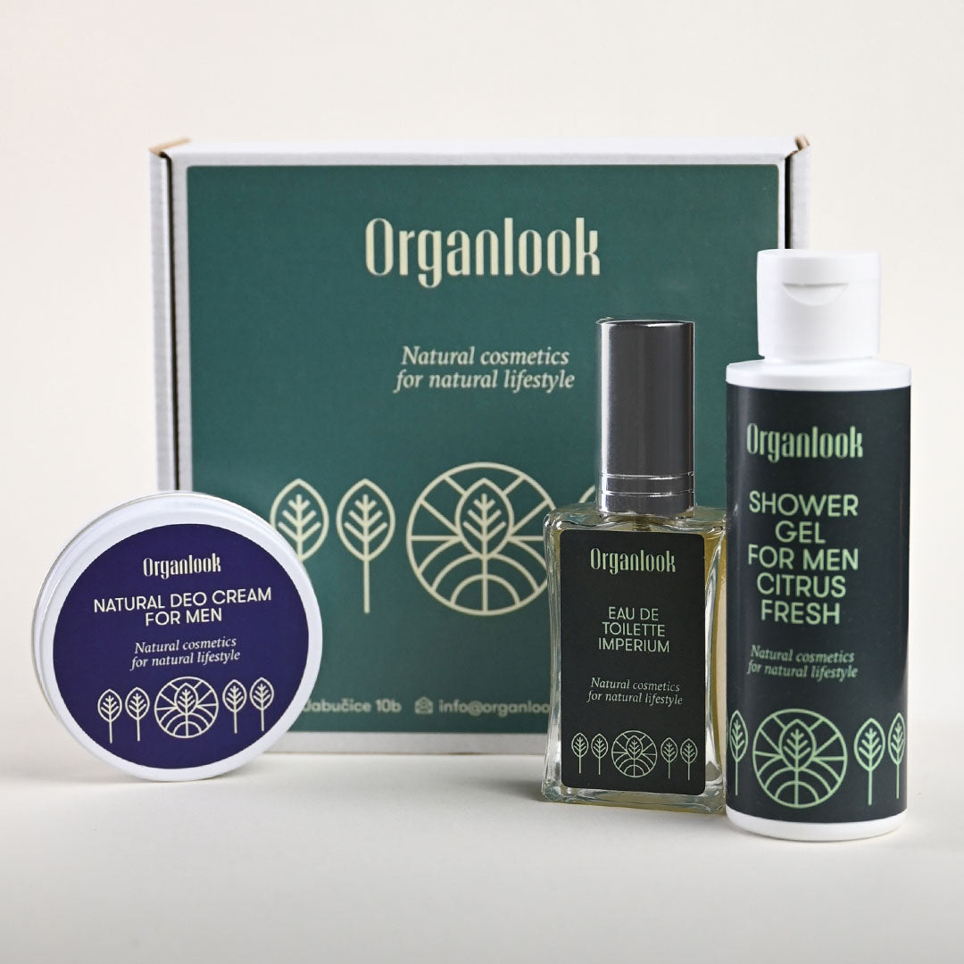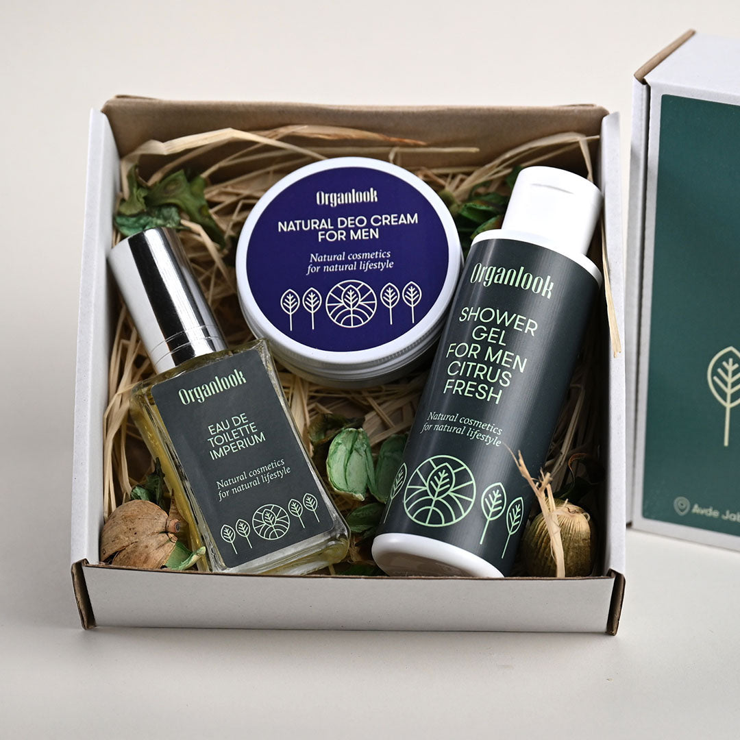 Muški poklon paket koji uključuje gel za tuširanje, prirodnu deo kremu i toaletnu vodu. Idealno za svakodnevnu njegu i ugodan miris, a namjenjeno muškarcima koji cijene kvalitet i udobnost